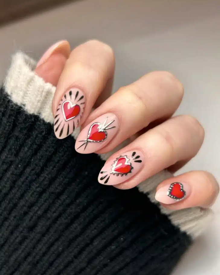 Achieve an eye-catching look with abstract Valentine-themed designs featuring bold hearts, graphic elements, and playful details. Begin with a soft nude base, then use contrasting colors to draw hearts, lines, and dots for a contemporary, artistic finish.