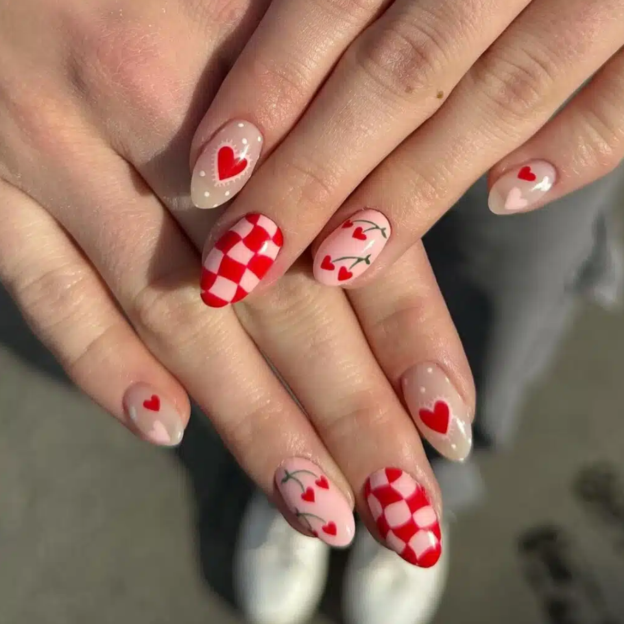 These nails are bringing all the fun vibes with a playful mix of checkered patterns, delicate cherry blossoms, and sweet little hearts. It’s like your nails are having their own mini art show!