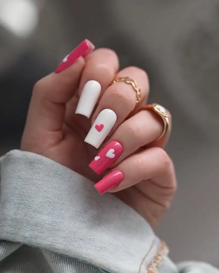 Simple, sweet, and oh-so-cute! These Valentine’s Day Nails feature a mix of soft white and bubblegum pink shades with adorable little hearts that add just the right amount of charm. It’s giving “effortlessly stylish” vibes while keeping things low-key romantic.