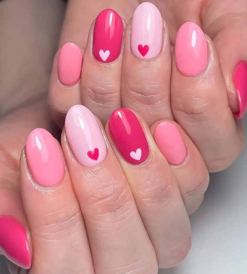 If you’re looking for playful yet fun Valentine’s Day Nail ideas, this design has you covered! Picture adorable pink and red hearts scattered across a soft pink ombre base—it’s flirty, cute, and totally on theme for the season of love.