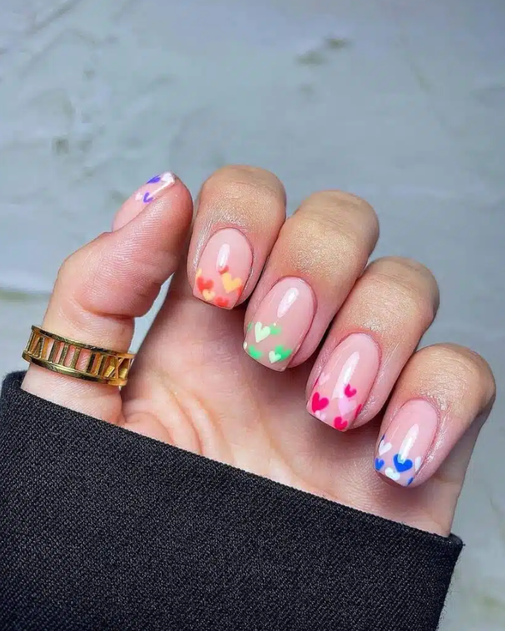 To recreate this style, paint the base nude, carefully freehand or stencil the heart tips in bold colors, and finally add a top coat for a glossy touch!