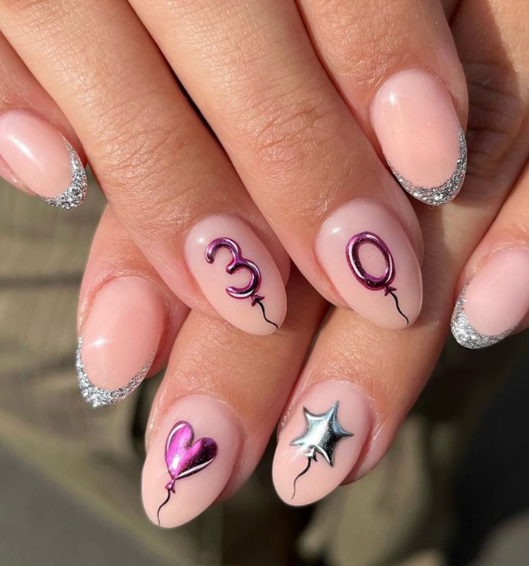 Chrome-magenta balloons “3” and “0” float across a sheer blush base, anchored by fine black strings. Silver-sparkle micro-French on the rest ties everything together—festive, adorable, and perfectly short for hands-on celebrating.