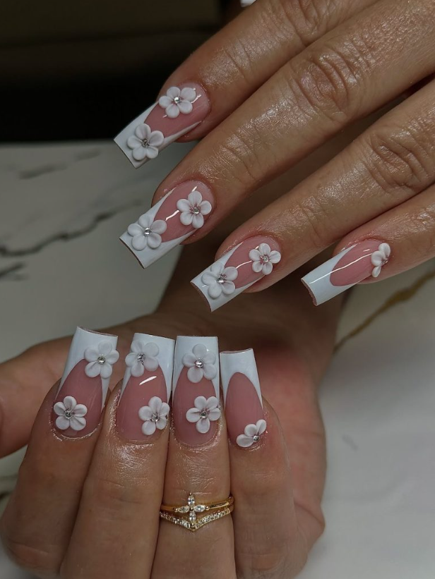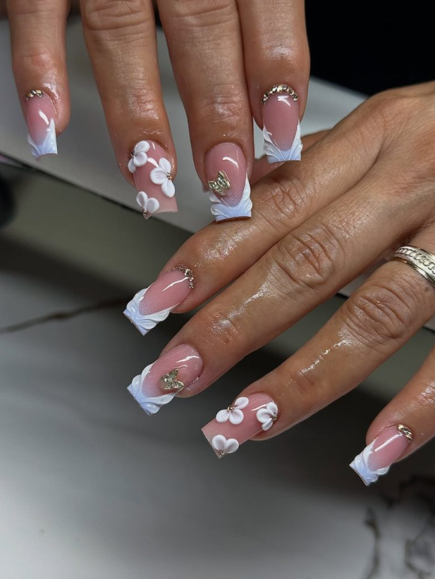Milky pink overlays meet frosted blue marble corners, trimmed with petite 3D blossoms and crystal arcs. The medium square length keeps it practical, while the florals deliver special-occasion sparkle.