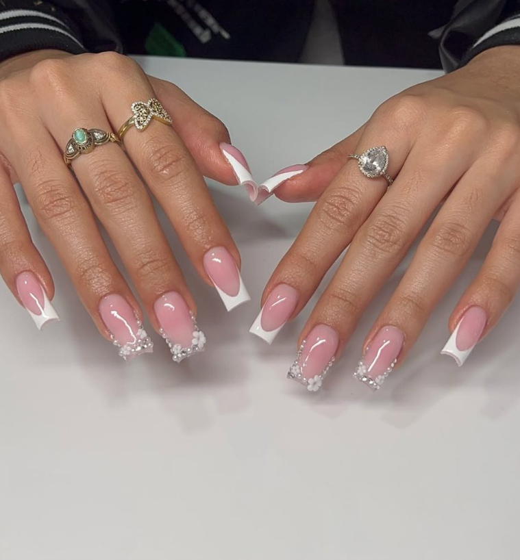 A modern take on bridal energy: sheer pink overlays on medium square tips, some finished with sculpted white French and others crowned with tiny pearl-petal clusters. It’s equal parts soft and statement—perfect for dinner reservations and dessert courses.
