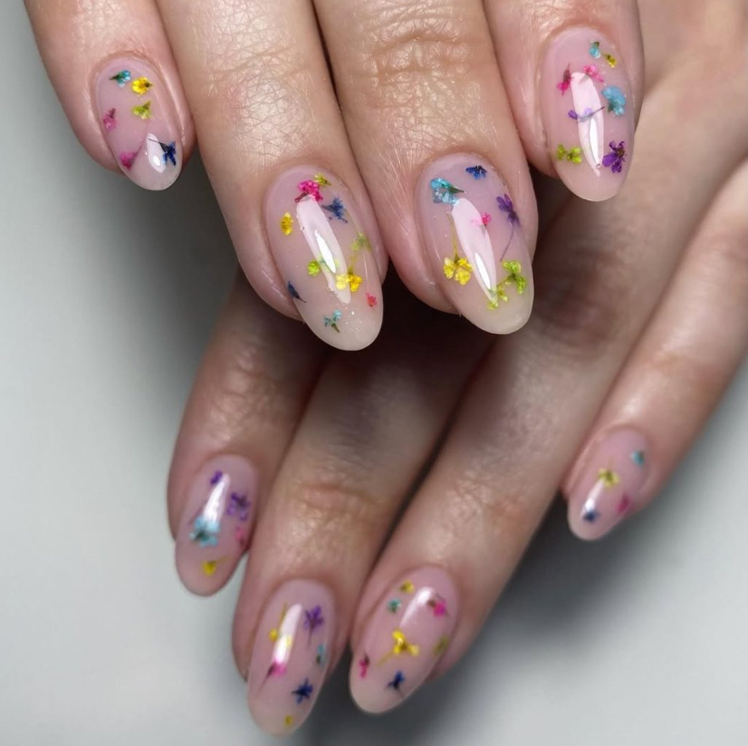 Delicate, multi-color butterflies float over a transparent nude—imagine confetti caught mid-air. It’s an easy, joyful option for brunch parties and daytime gatherings.
