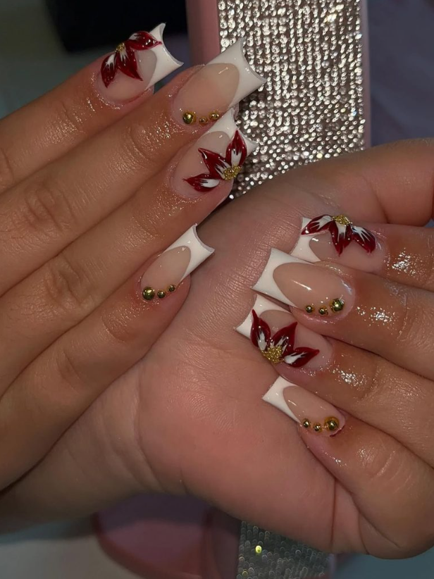 Sharp white V-French meets burgundy petals and micro studs—elegant with a whisper of drama. The proportions flatter medium lengths and feel red-carpet Classy for a dinner reservation birthday.