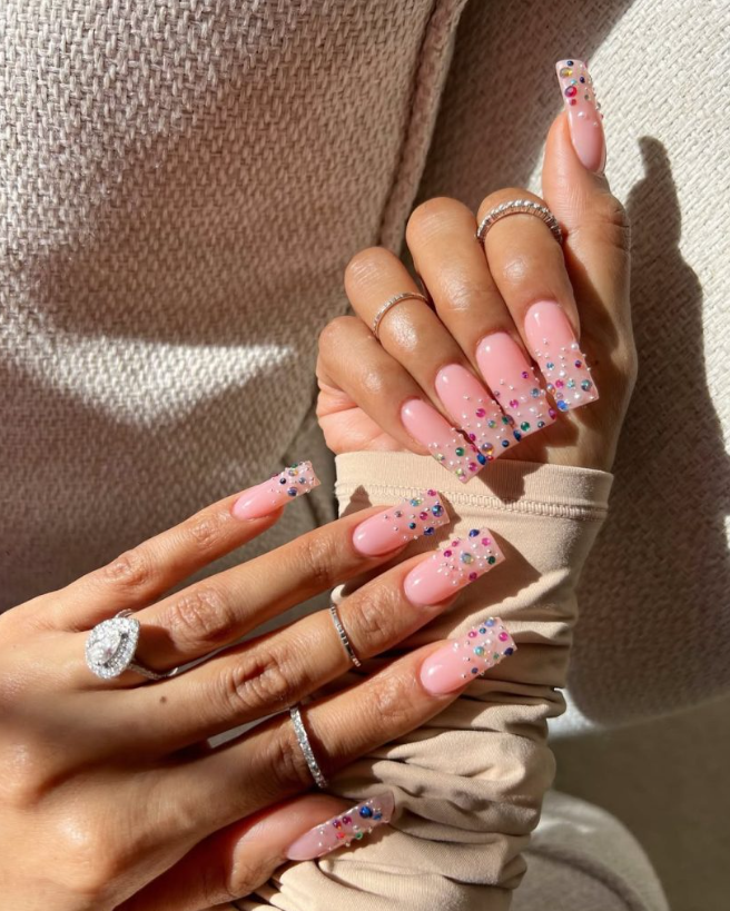 Sheer ballet Pink meets a party of crystals clustered along the tips—like sprinkles on frosted cupcakes. The length and symmetry signal luxe acrylic energy while staying wearable for clinking glasses and photo-ops.