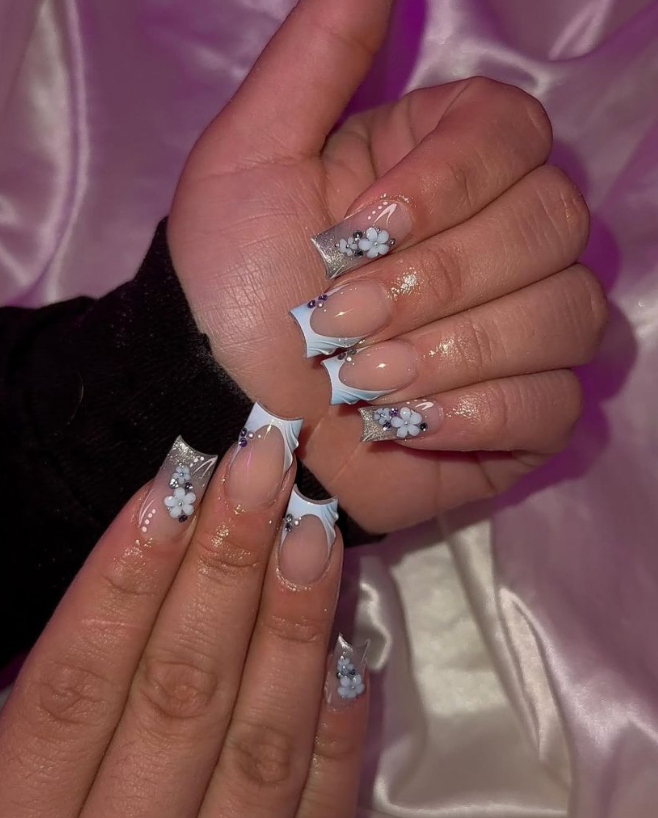 Ice-blue French panels meet frosted silver and 3D blossoms on sculpted square tips. It’s a winter-party fantasy that still reads polished thanks to the negative space and careful symmetry.