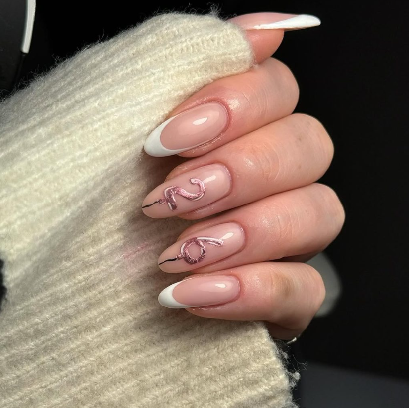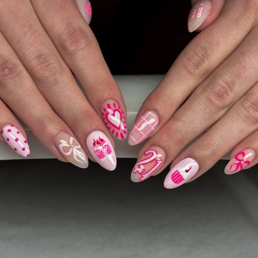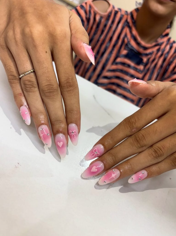 Pink-to-white ombré with tiny bows, hearts, and crystal dots delivers romance without going saccharine. The tapered silhouette softens the look—cute but grown.