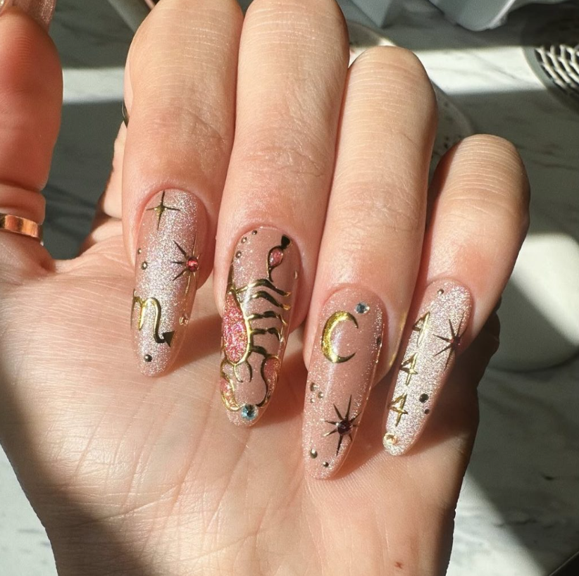 Nude shimmer turns decadent with gilded outlines—scorpion, crescent, constellations—and pinpoint gems. It’s astrology, but eveningwear.
