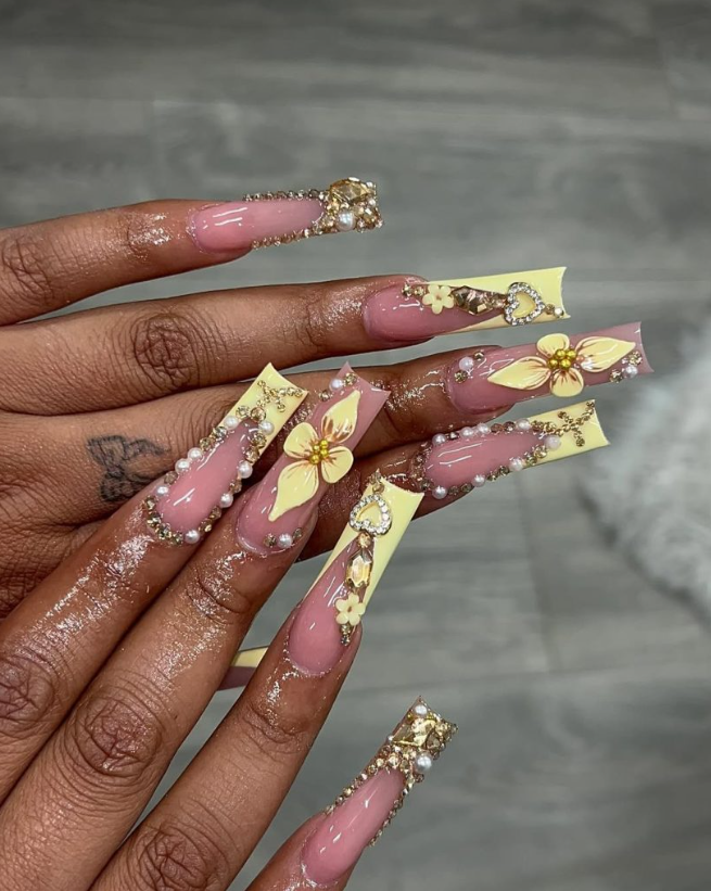 For the guest of honor who lives for statements: elongated coffins drenched in honey-yellow accents, jeweled borders, and dimensional flowers. The mix of pearls, crystals, and cut-out angles brings couture energy to the table.