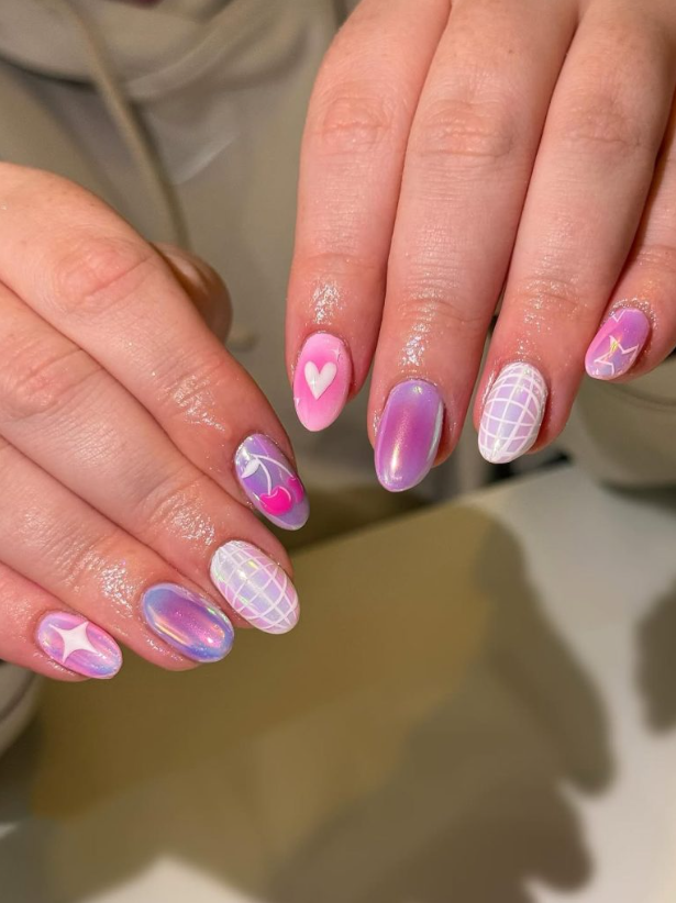 Soft purple-pink aura nails meet white lattices, starbursts, and candy hearts—an upbeat collage that’s party-proof at short to medium length. The glossy finish catches every candlelight flicker.