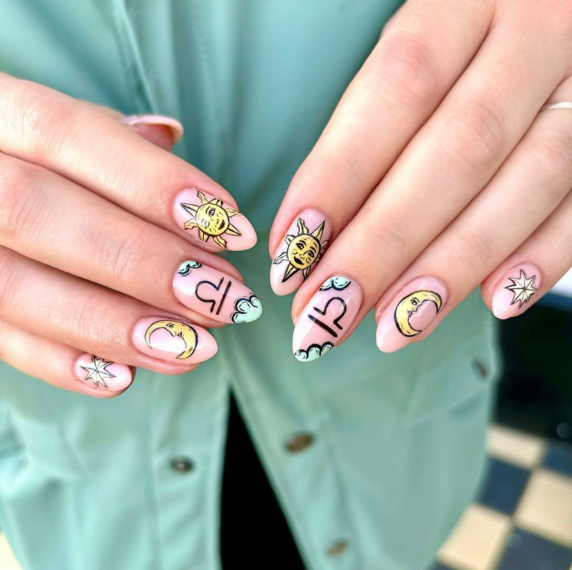 A whimsical storyboard—tiny suns, moons, clouds, and Libra glyphs—outlined in black on a blush base with mint edging. Think boutique stationery meets birthday manicure.