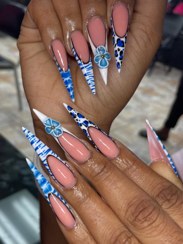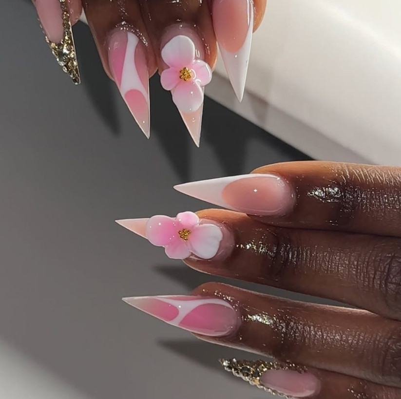 Ultra-pointed stilettos sculpt the hand; milky swirls and a single 3D blossom add softness. The balance of edge and sweetness makes this a trendy birthday pick.