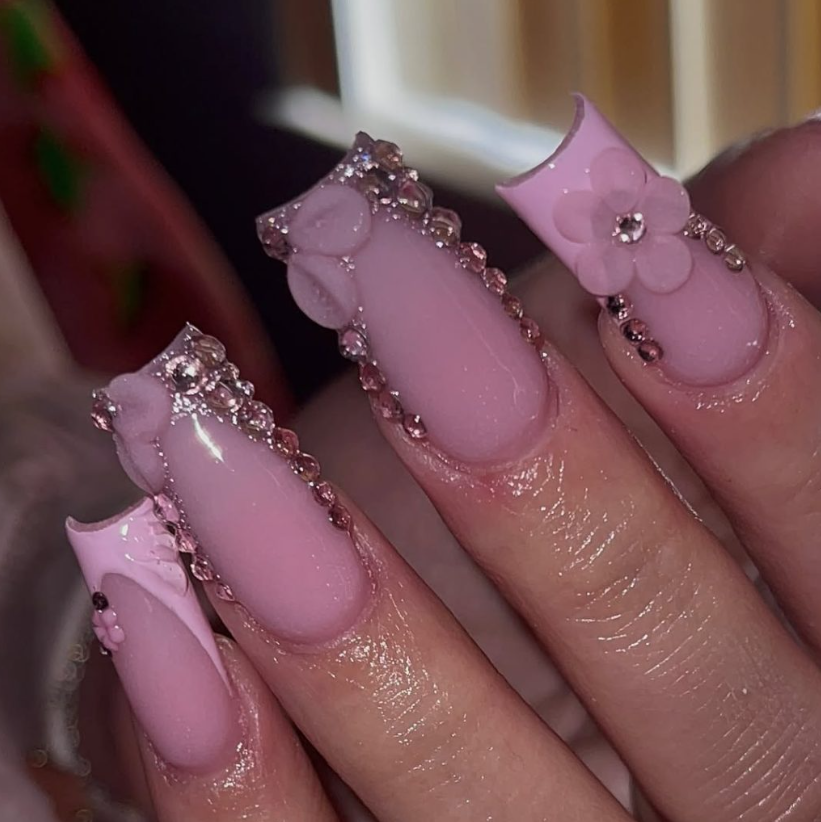 Candy-pink nails framed with rose crystals and topped with petite sculpted flowers deliver a sweet-but-polished vibe. The gently tapered silhouette sits between square and coffin, keeping the look feminine and camera-ready.