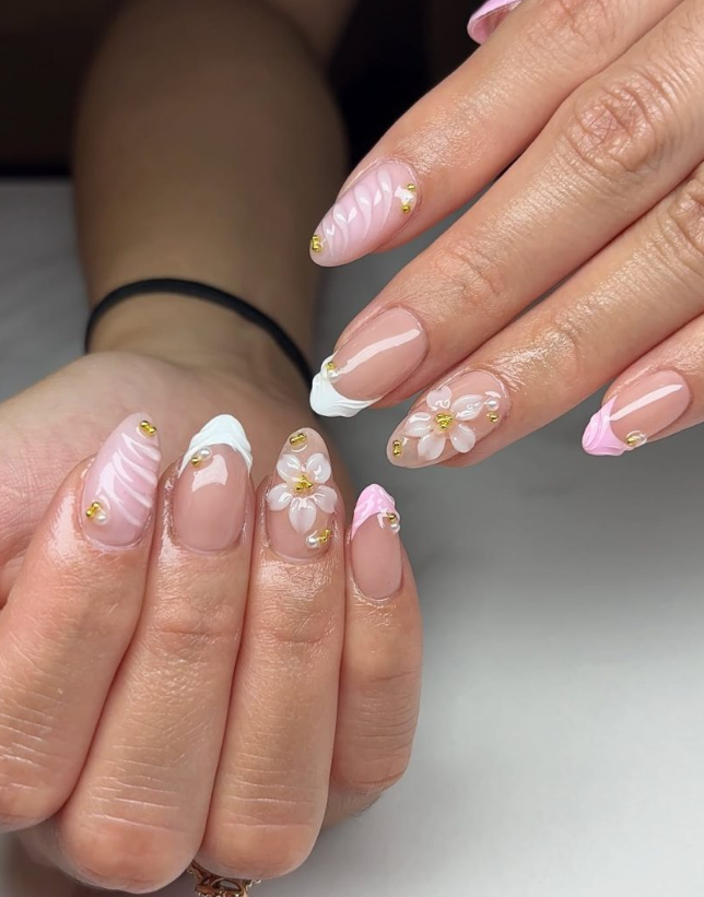 Soft almond tips wear alternating pink swirls, crisp white mini-French, and translucent daisies pinned with gold studs. The mix feels tailored, not busy—ideal for brunch-to-cocktails birthdays.