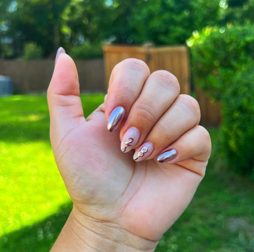 Two nails wear liquid rose chrome; the others stay translucent with whisper-thin marble squiggles and petite metallic number accents. It’s the minimalist’s birthday manicure—quietly trendy and incredibly wearable, even beyond the party.