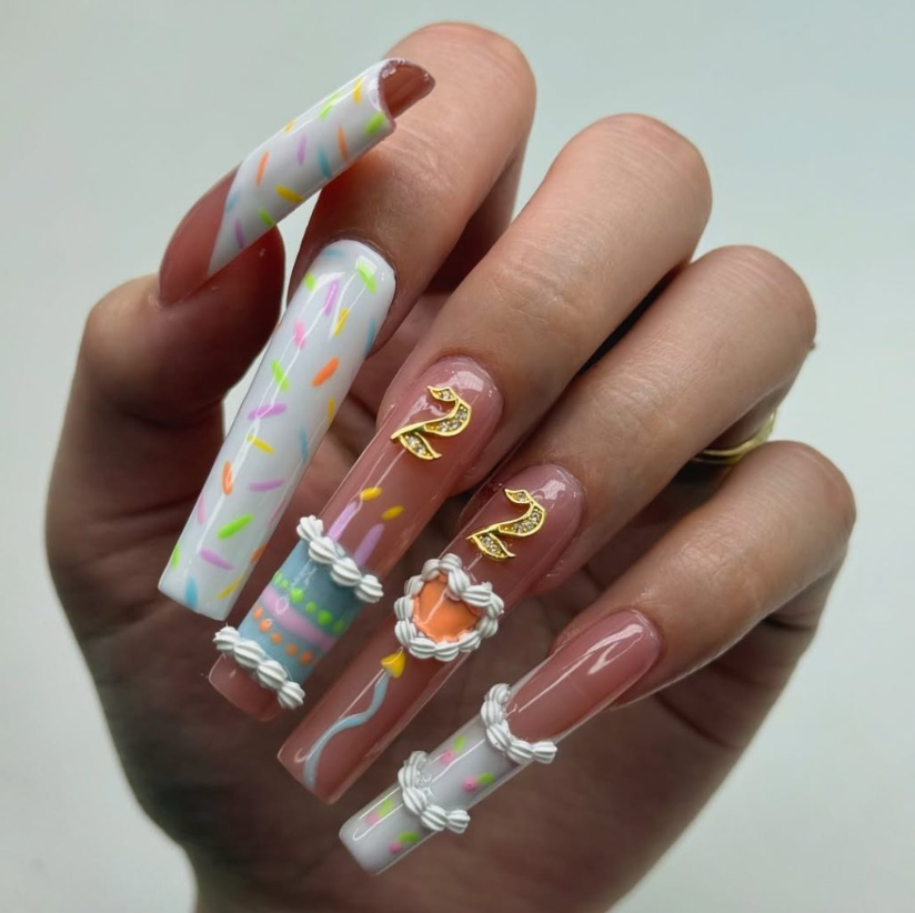 Candy-white tips with rainbow sprinkles meet piped “frosting” borders and metallic gold “22” charms—like a dessert table you can wear. Long, glossy lengths say VIP, while the pastel palette keeps it cheerful and very fun.