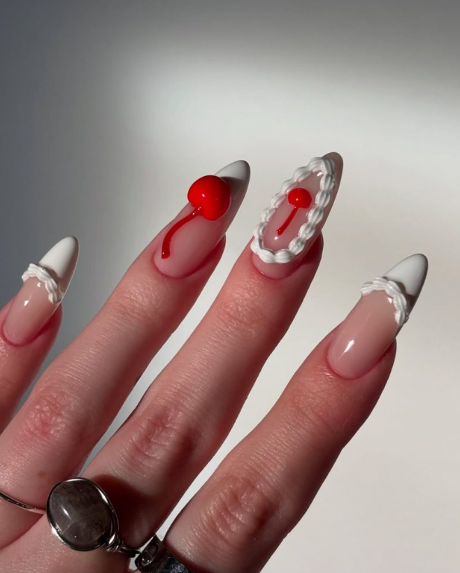 A piped-frosting French border the nail-like cake décor, while glossy cherry “drips” add playful contrast. It’s dessert-first energy that still feels editorial.