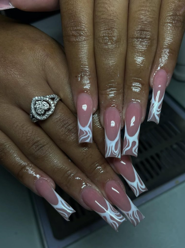 Graphic white flames lick through negative-space panels on rosy acrylic squares—a clean, architectural take on party nails that pairs with everything.