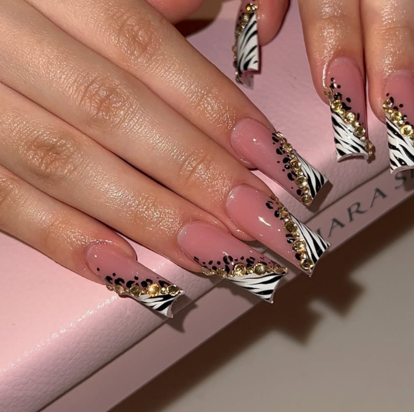 Monochrome zebra tips trimmed with onyx dots and gold studs bring runway animal print into a polished party manicure. The elongated coffin silhouette reads high-fashion.