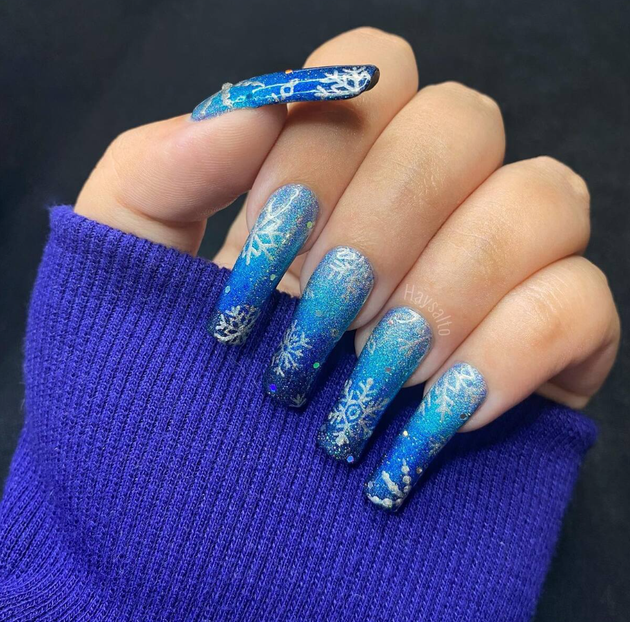 A stunning blend of icy blue creates a mesmerizing winter-inspired manicure.