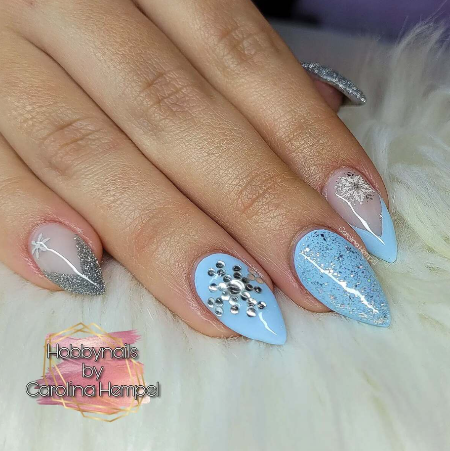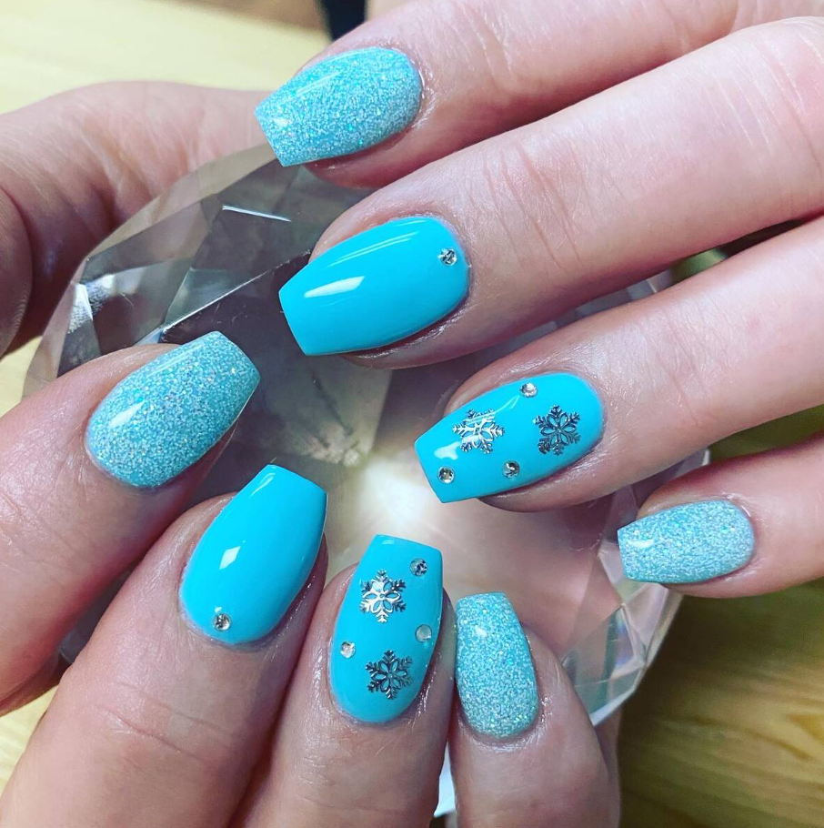The mix of glossy blue polish and glittery silver accents gives the nails a radiant frosty glow, while delicate rhinestones and metallic blue snowflakes add a chic, festive touch.