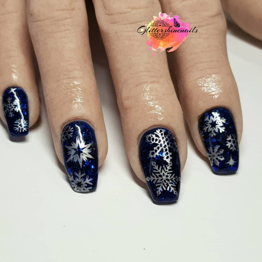 Rich midnight blue glitter serves as the perfect canvas for delicate silver snowflakes, creating a look that’s both bold and enchanting.
