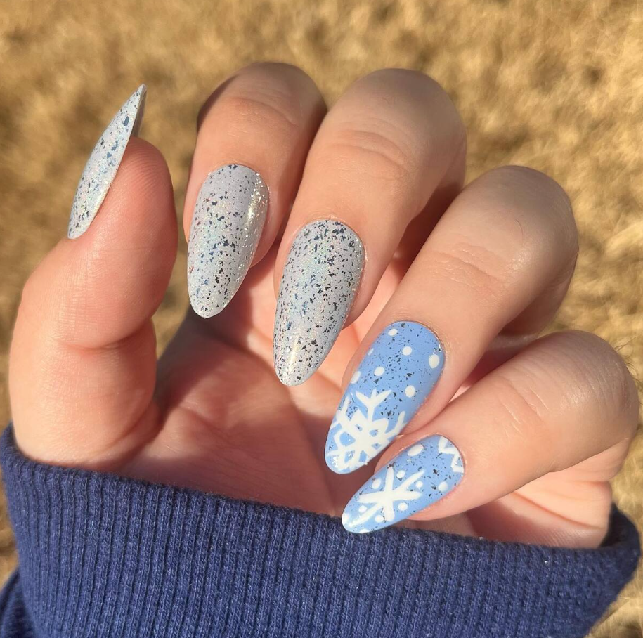 The almond-shaped nails alternate between glittering silver gradients and rich, icy blue tones, while a single delicate snowflake accent adds a touch of seasonal grace.