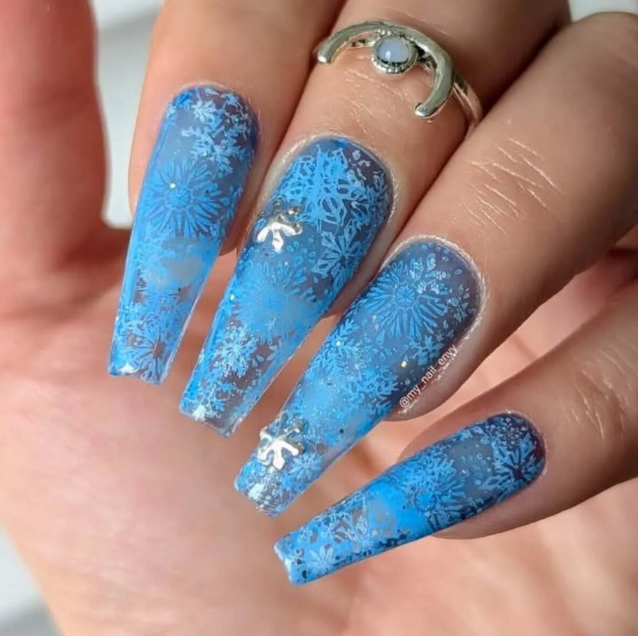 Elegant snowflake accents and starlit details illuminate the nails, while nude sections and crisp blue tips add a modern twist.