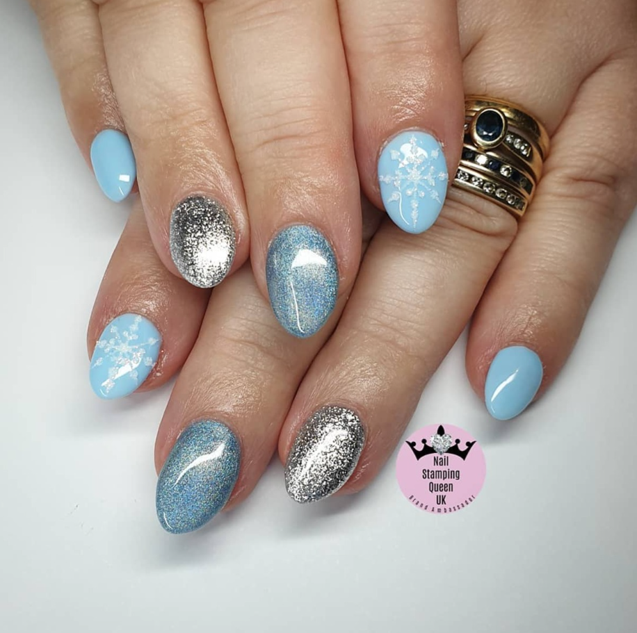 Shimmering silver glitter and holographic snowflakes add a frosty sparkle, beautifully contrasting with the glossy blue nails.