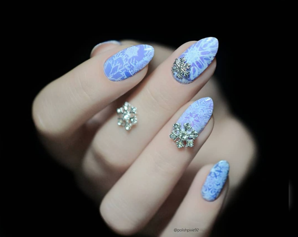 Soft icy blue and gleaming silver combine to create a luxurious winter-inspired manicure.