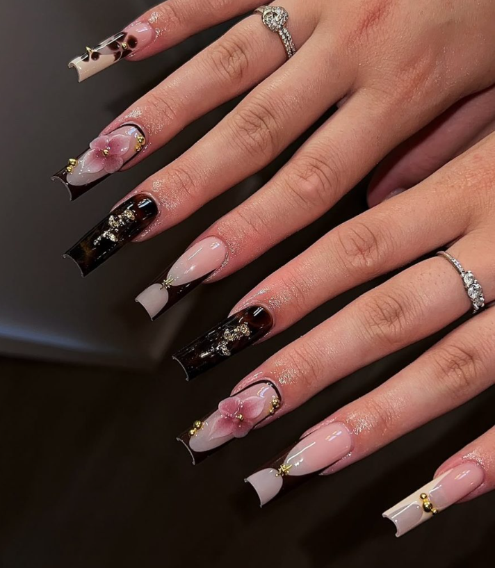 High-gloss tortoiseshell tips in syrupy brown and inky black meet sheer beds, then bloom into sculpted flower accents and glinting gold beads. On long square nails, it’s jewelry-level detail—decadent yet tasteful.