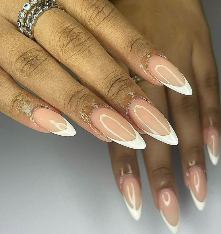 A sharp white French with a second tracing line inside the tip creates negative-space architecture—clean angles, high gloss, museum calm. The tapered almond silhouette elongates fingers and plays beautifully with statement rings. Minimalist design, maximum polish.