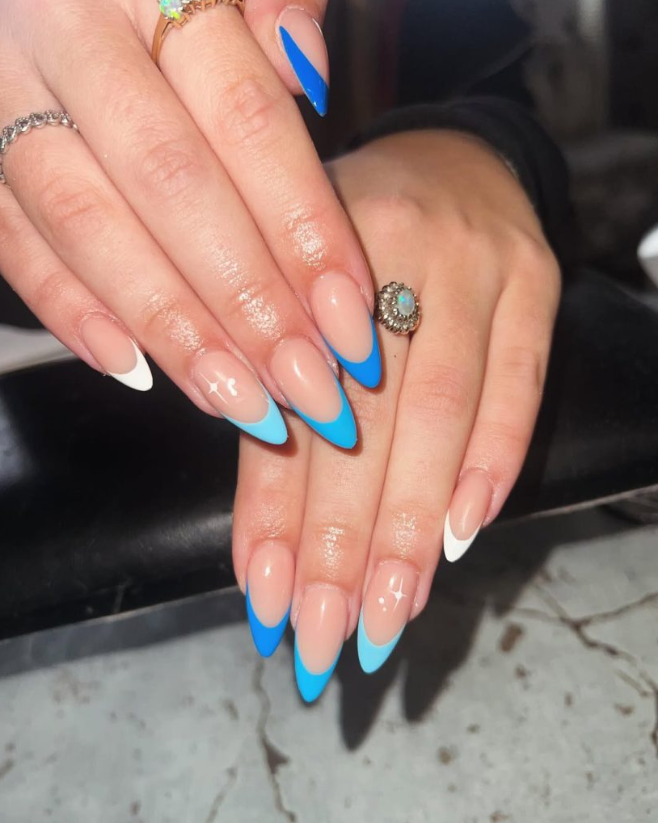 Alternating cool-tone tips—cerulean, sky, and snowy white—turn a French into Riviera daydreams. The sleek almond shape keeps it sophisticated, while the color blocking makes a sunny statement. Under the gloss you still get breathable negative space; it’s thoughtful design with a vacation spirit.
