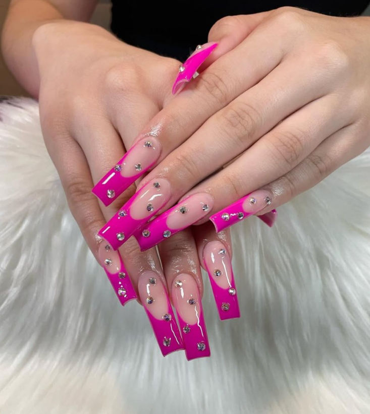 A saturated magenta edge with scattered crystals that travel from the smile line inward, like champagne bubbles. The drama sits at the tip, leaving the nail beds fresh and neutral. The silhouette is modern glamour—long square designs with a confident stance.