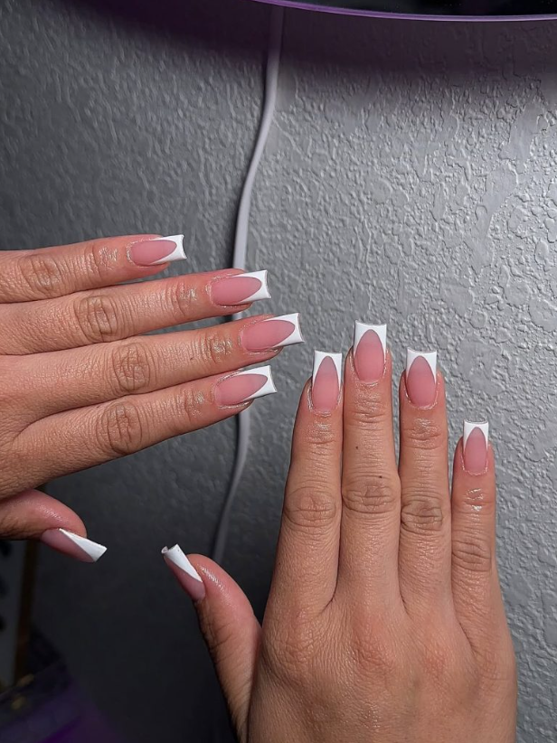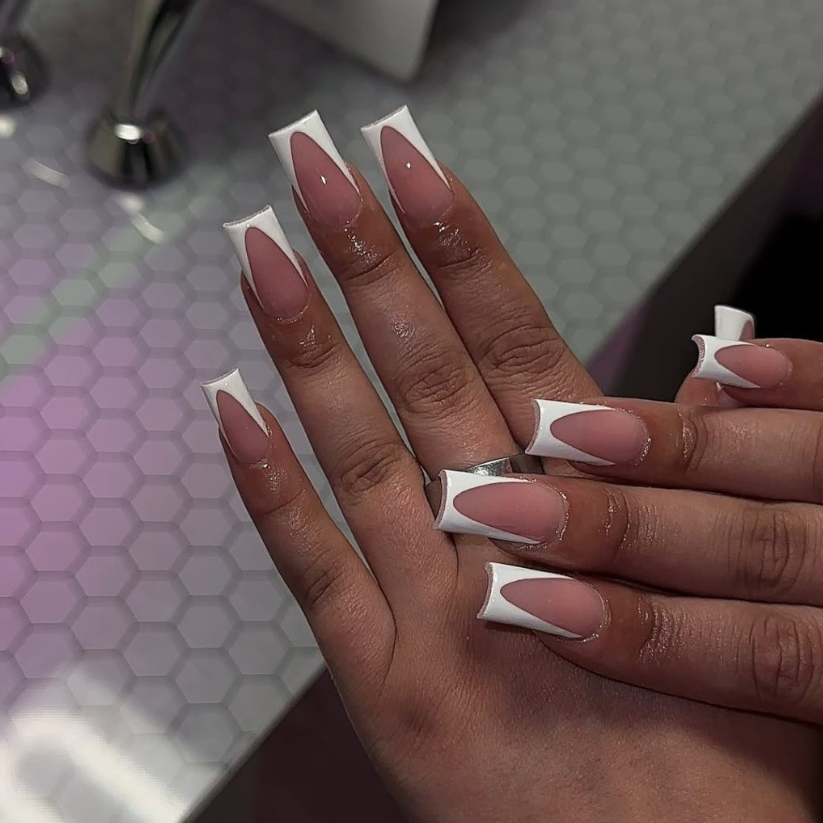 A sculptural V-shaped White edge elongates Medium square nails—graphic, camera-ready, and surprisingly versatile. This is the French to choose when you want a clean line that still makes a statement.