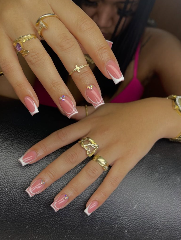 A slim white outline traces a soft pink base, then tiny gems dot two accent nails—enough sparkle for a dinner reservation but still office-friendly on medium square lengths.