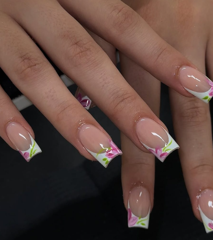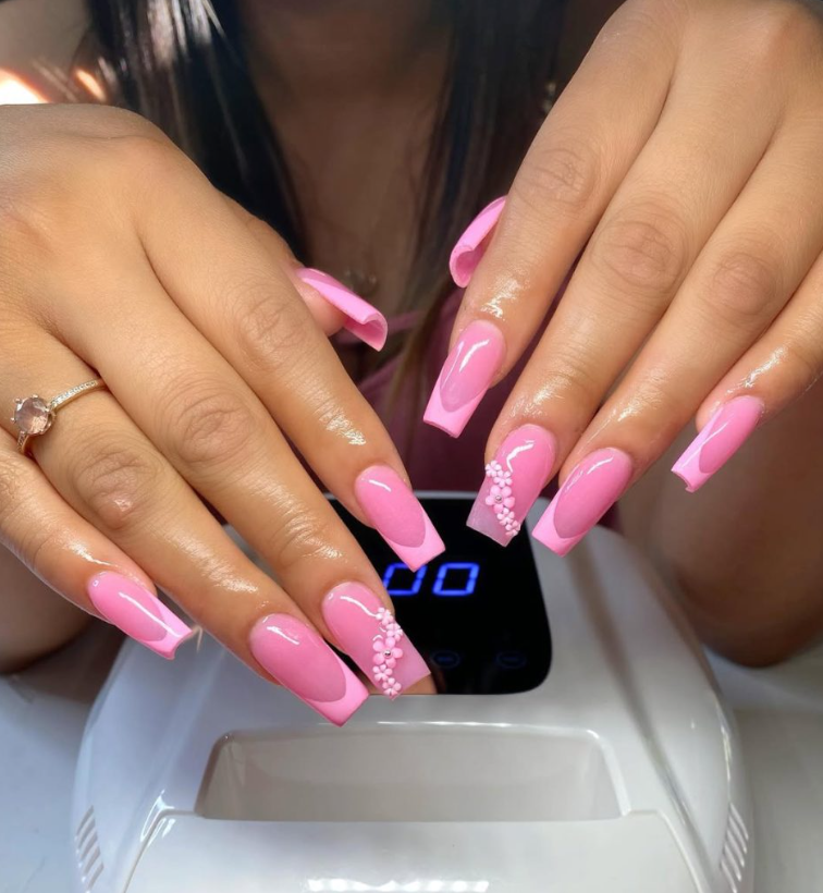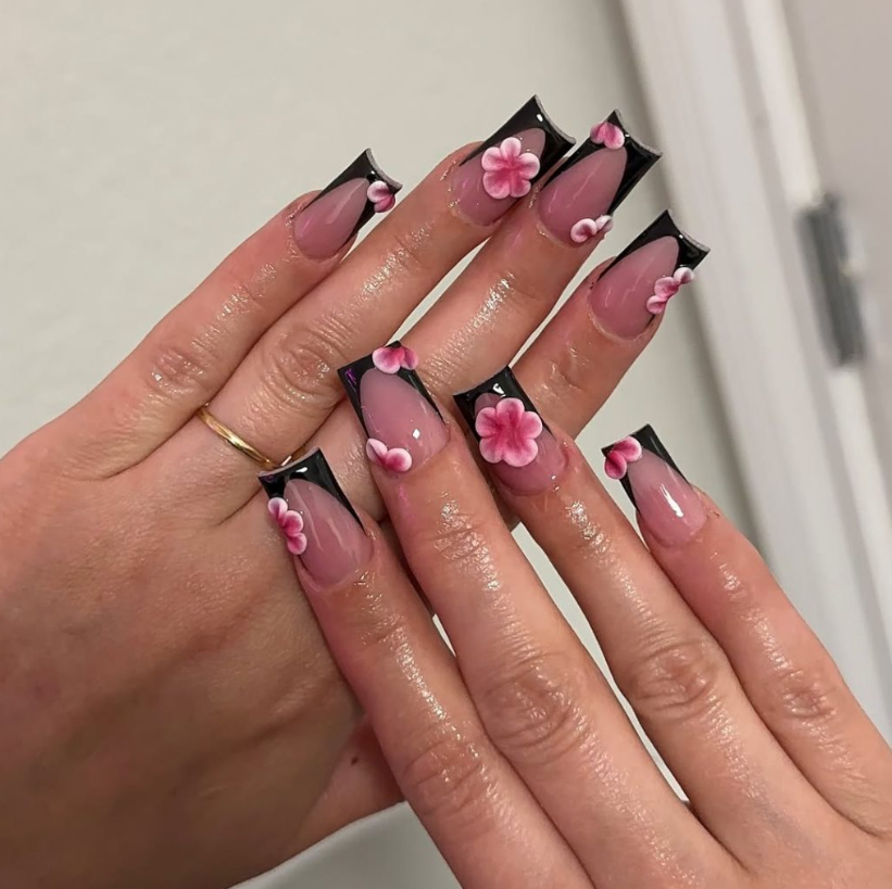 High-shine Black French tips anchor plump, hand-placed blooms in gradient pink. The result is dramatic but wearable thanks to the clean square structure and neutral beds.