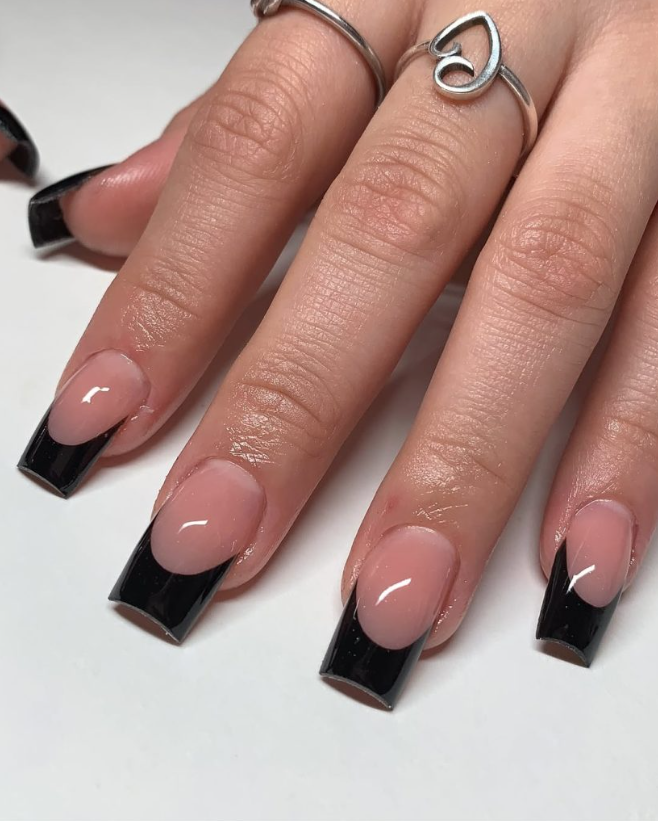 Jet black tips on a milky pink base give Old Hollywood drama without the maintenance of lipstick red. The proportions are deliberately compact—true Short Square—so the curve at the smile line feels soft and wearable for keyboards and coffee runs. Graphic yet timeless design.