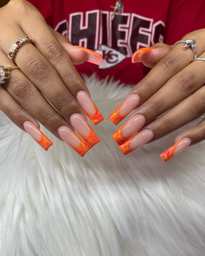 A juicy take on summer energy: molten orange-and-tangerine marbling poured just along the edge of a glossy nude base. The silhouette is unapologetically runway—clean, confident, long, square designs—so the pattern reads intentional rather than busy. This is pure color joy with precision design at the tips.