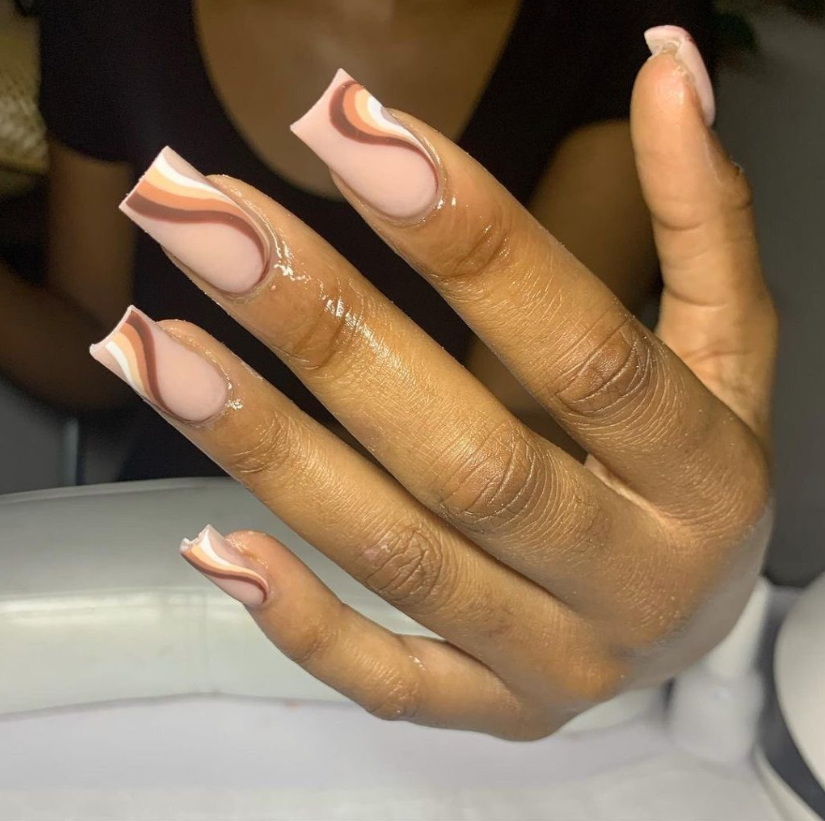 Neutrals get interesting: a beige base with slim cinnamon and ivory swirls hugging the tips. The proportion is perfect for everyday typing and weekend errands—short, precise, and quietly chic. The shape is a textbook short square.