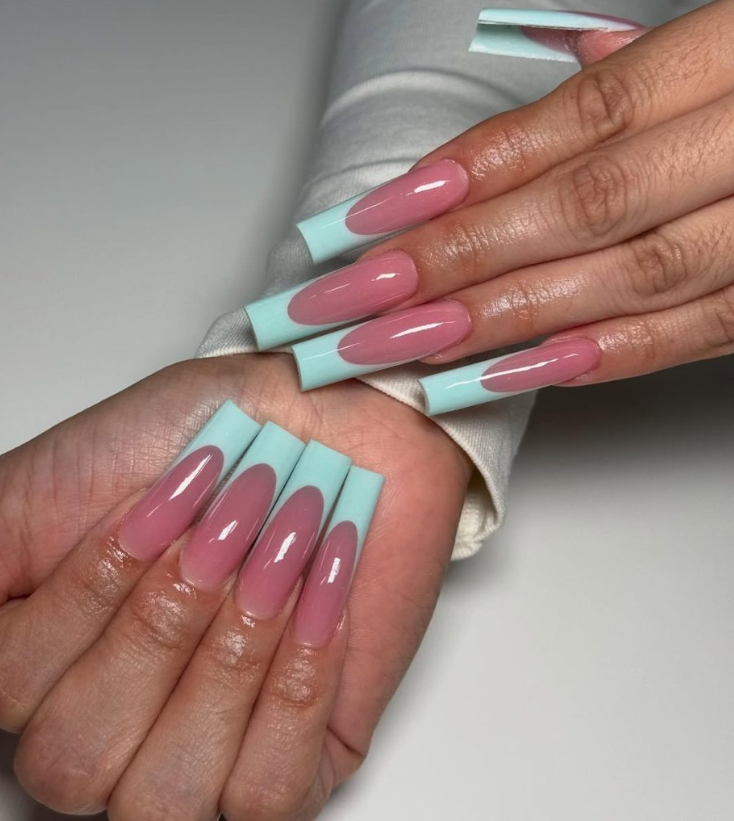 Pastel mint tips frame an elongated oval window, stretching the nail bed for that elegant “pianist fingers” effect. On long square acrylics, the geometry reads sleek and modern—a perfect desk-to-dinner set for women who like their square designs crisp yet playful.