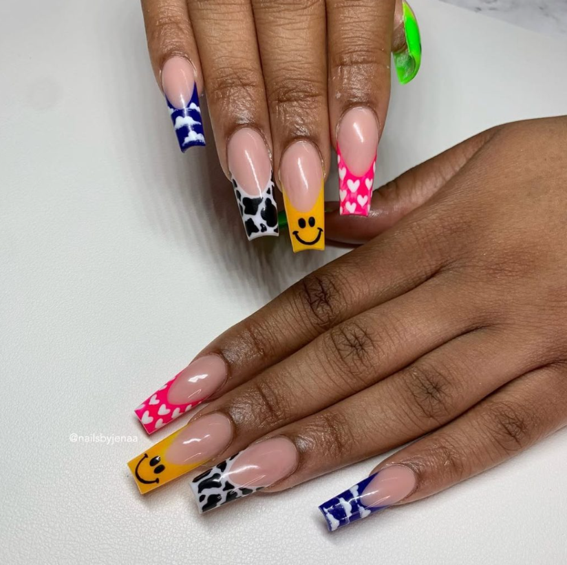 There’s a reason this set gets stopped at the coffee line: each tip carries a different micro-print—airy cobalt clouds, monochrome cow spots, hot-pink mini hearts, and a sunny smiley. The base is a sheer neutral, so the edges steal the show. Shape and length read decisively long square designs, which make patterns look crisp rather than crowded.
