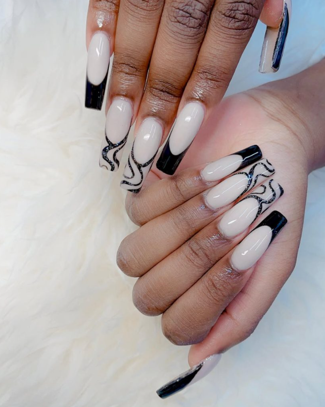 Creamy nude bases meet inky black tips, interrupted by glittered S-curve waves on select nails. It’s the French tip’s after-dark cousin—graphic, sleek, and slightly baddie without trying too hard. The shape leans long, square designs and photographs like a dream against a latte or a steering wheel (we all take that shot).