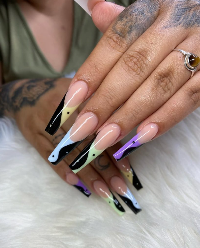 Pastel mint, lilac, and sky tips curve into glossy black yin-yang sweeps punctuated by tiny dots. The negative space keeps the look breathable, while the silhouette stays sleek with long square designs.