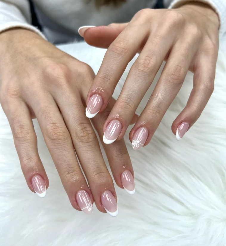 If your calendar says meetings at 10 and martinis at 7, this set splits the difference. A sheer base with crisp white tips and a single micro-bow accent on select nails. The length sits at a refined medium, ideal for daily life while still being camera-ready.