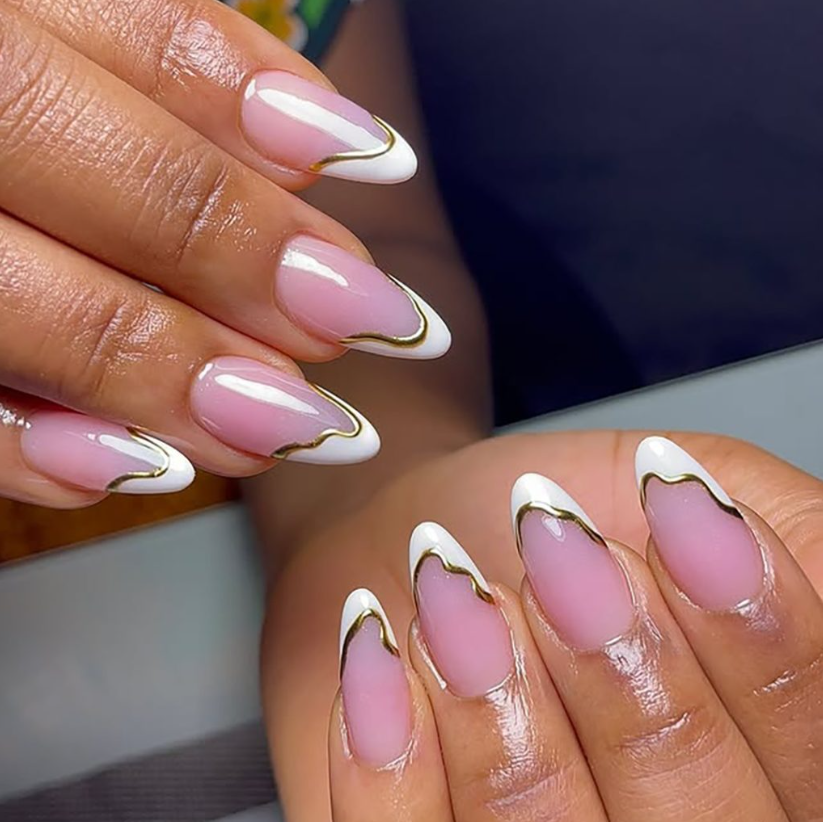 A sleek almond set dressed in crisp white tips and traced with a delicate gold ribbon. The metallic outline adds just enough sparkle to register as design, while the negative space keeps everything elegant for 9-to-5. Ask your tech for a soft apex and ultra-gloss topcoat so the gold reads jewelry-like, not glittery.