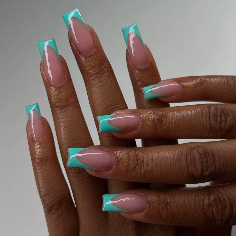 A cool sea-foam hue arcs across medium square nails, leaving airy windows of nude for a light, modern take. The asymmetry is subtle with design, perfect if you want color without a full commitment.