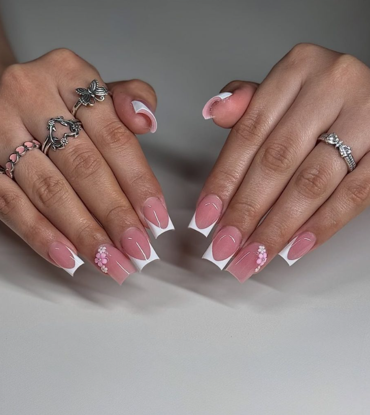 Porcelain White frames carve chic cutouts, while baby-pink bead flowers perch on the ring fingers. The negative space keeps it airy; the accents deliver romance without going full bridal.